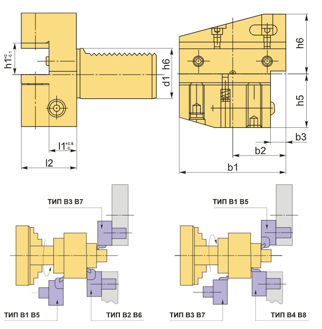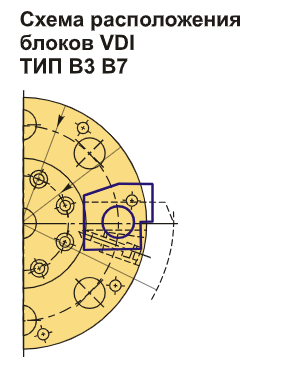 Инструментальный блок VDI30 типа B3 предназначен для резцов с прямоугольным сечением и применяется для выполнения наружной продольной обработки и торцевого точения. Резец устанавливается с пластиной вниз, что позволяет ему иметь опорную поверхность выше оси центров.