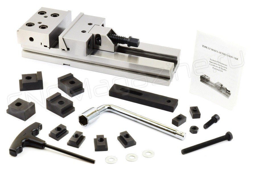 Все части тисков GT взаимозаменяемые с частями других моделей серии, имеющих губки того же размера. Составляющие можно размещать на базе в удобном расположении, развернуть, снять и т.д., так как тиски GT являются модульными.